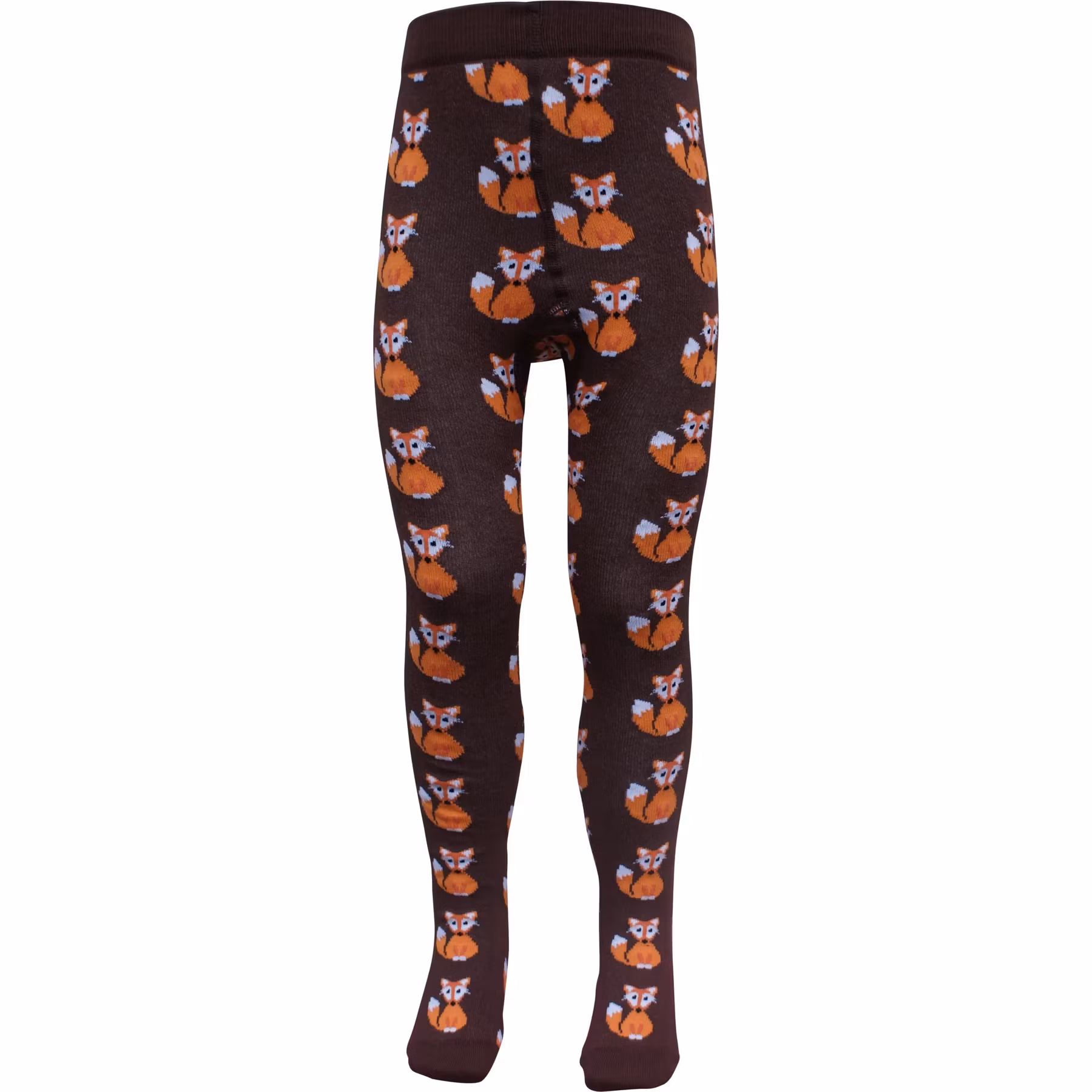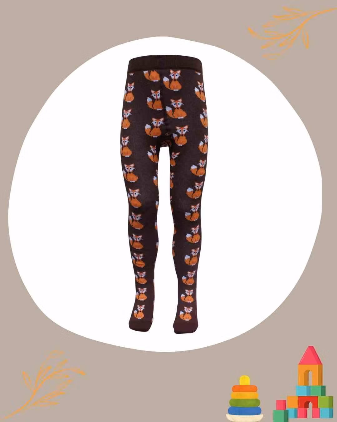 Söta rävmönstrade barnstrumpbyxor på brun botten.