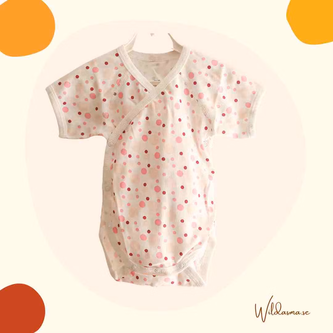 Kortärmad baby body i ribbad bomull omlott modell med knappar i sidan.