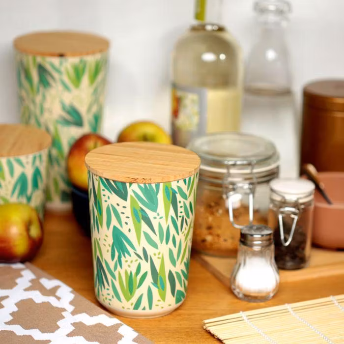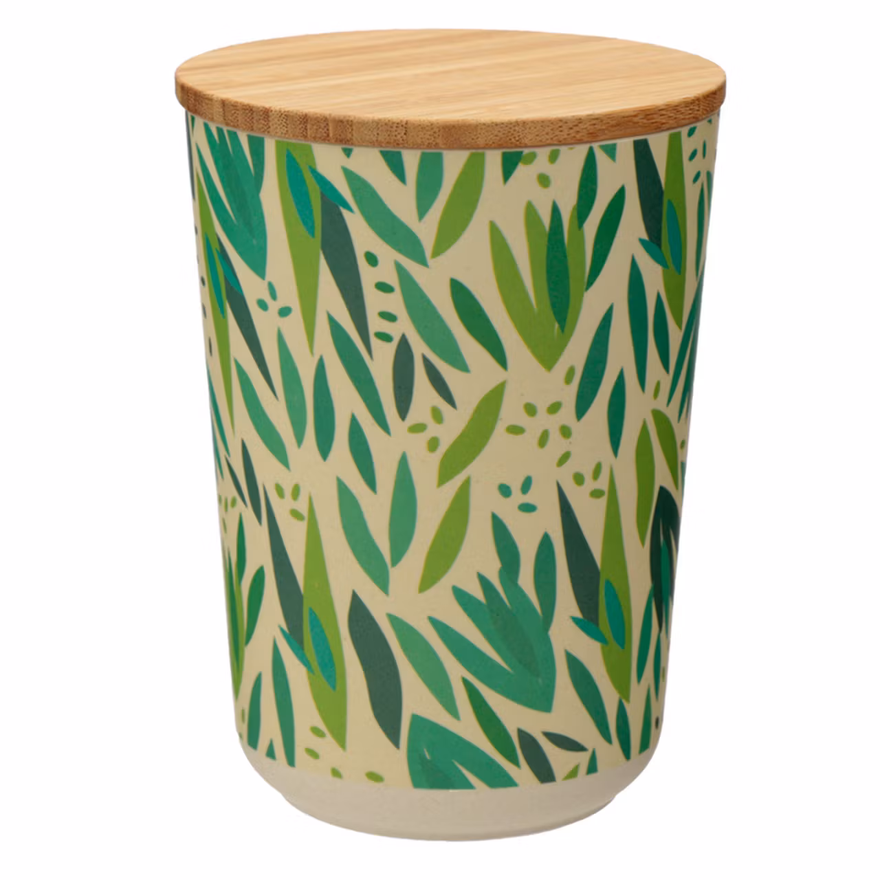 Förvaringsburk i naturvitt mönstrad med blad av tårpil .750ml. Trälocket är tätat med återanvänt silikon.