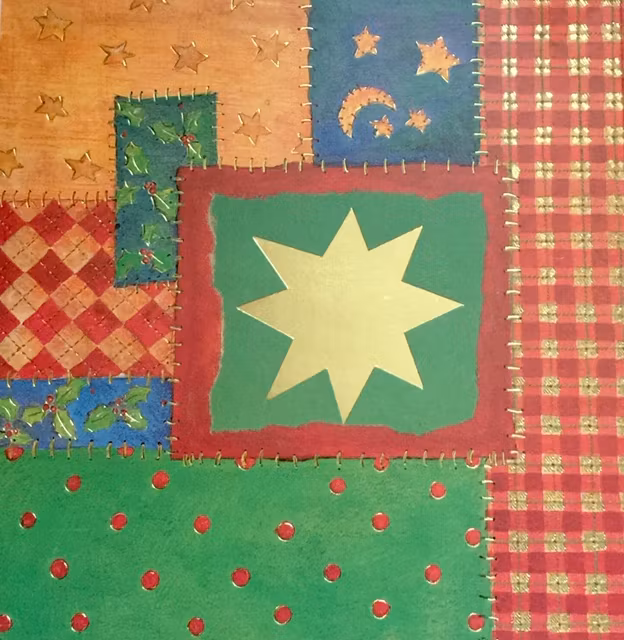 Snyggt motiv som ett lapptäcke med gulddetaljer så som stjärna, stygn och prickar.
