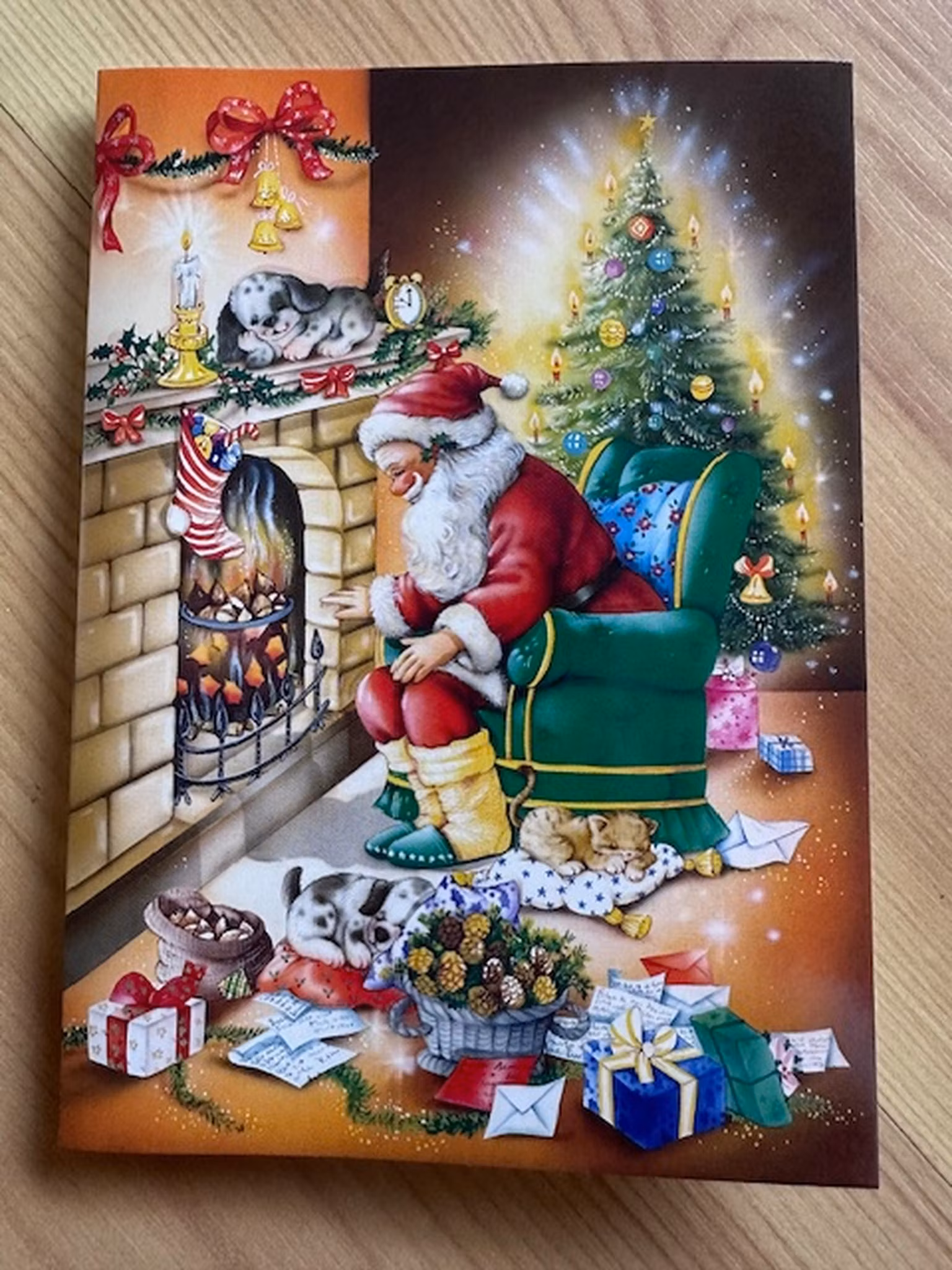 Motiv är Tomten som sitter framför brasan.