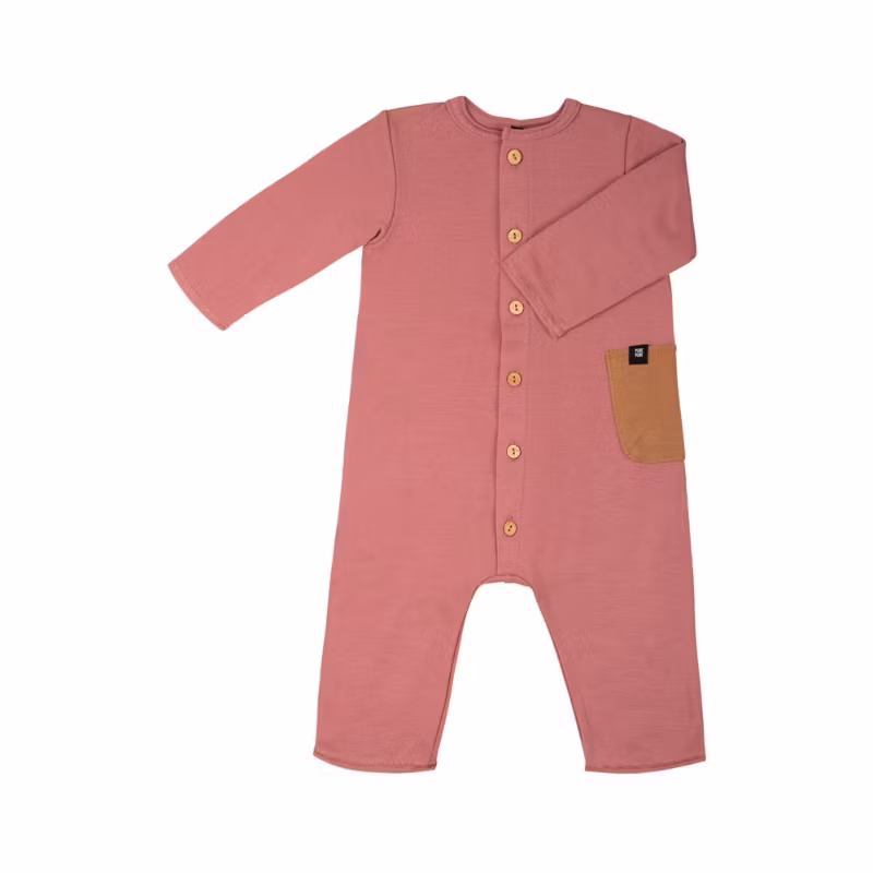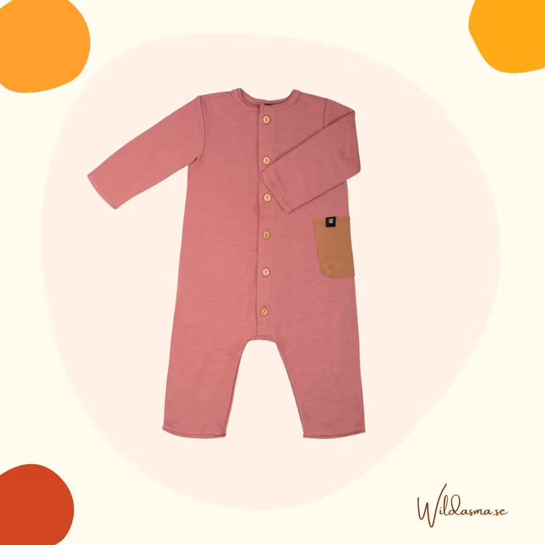 Denna jumpsuit är designad med fina träknappar fram för enkel av- och påklädning. Ett stilrent plagg som kombinerar funktion, komfort och hållbarhet.