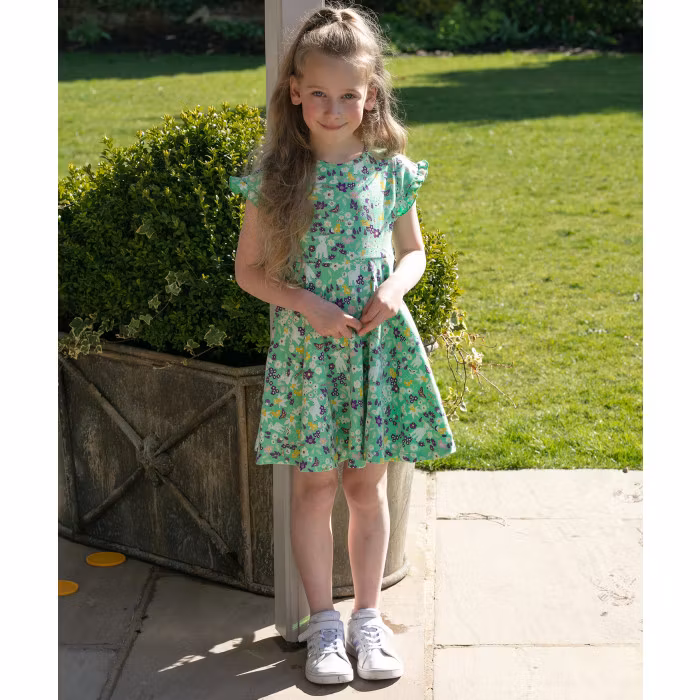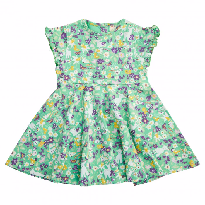 Sommarklänning för barn – mintgrön med blommor, lamm och ankor i 100% ekologisk bomull | Piccalilly
