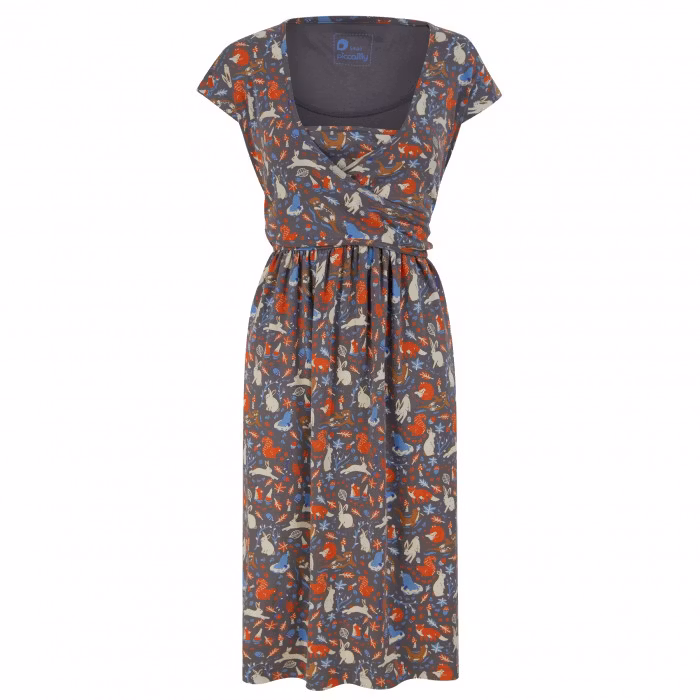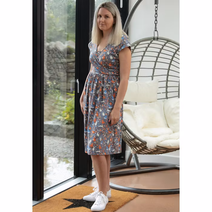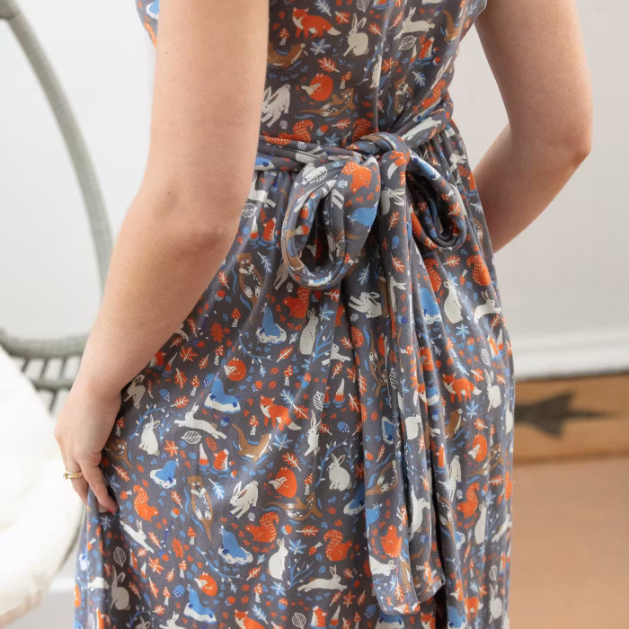 Den perfekta klänningen för alla tillfällen! Med en tidlös grå bas prydd med charmiga kaniner och skogsdjur är denna omlottklänning både elegant och lekfull. Tillverkad i 95% ekologisk bomull och 5% elastan, erbjuder den en mjuk, följsam och stretchig passform som gör den otroligt bekväm att bära.