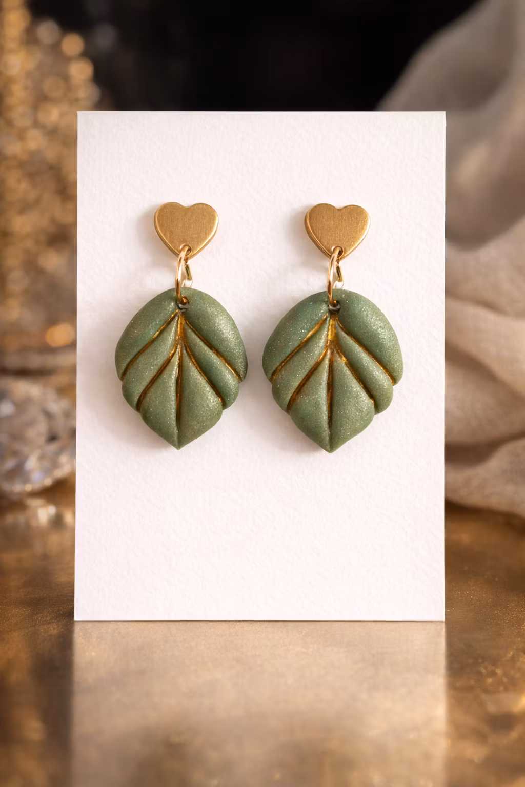Dessa unika örhängen är formade som stiliserade blad i en mjuk, dämpad grön nyans med subtilt skimrande yta. De vackra guldfärgade detaljerna i bladens ådring lyfter designen och ger en exklusiv, handgjord känsla som fångar ljuset på ett elegant sätt.