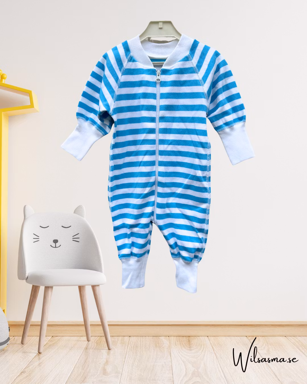 Pyjamasen är märkt med 50cl men är väldigt stora i storleken, mer som 62/68cl. Randig turkos / vit i tjock härlig bomull.