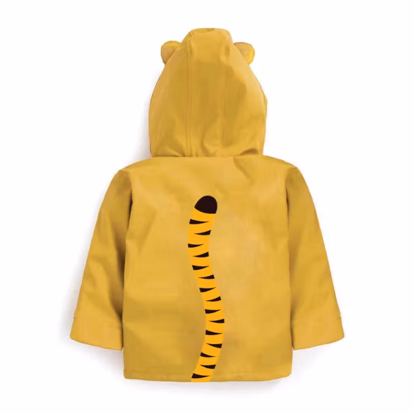 Regnjacka i gult med tiger ansikte med öron på huvan samt söt svans på ryggen.