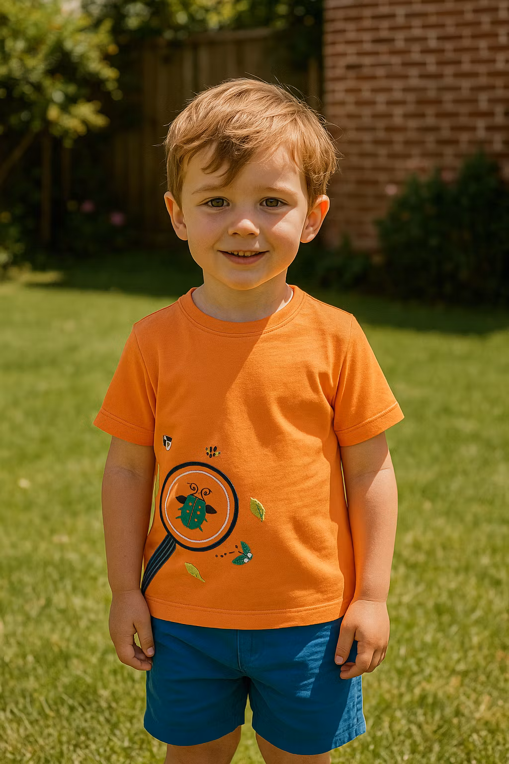 Ge ditt barn en rolig och färgglad stil med vår kortärmade t-shirt i en livlig orange nyans och ett charmigt motiv av ett förstoringsglas som upptäcker småkryp. Perfekt för både flickor och pojkar tack vare sin unisex-design och färger. Tillverkad av kemikaliefri ekologisk bomull som är skonsam mot känslig hud, vilket gör den bekväm att bära hela dagen.